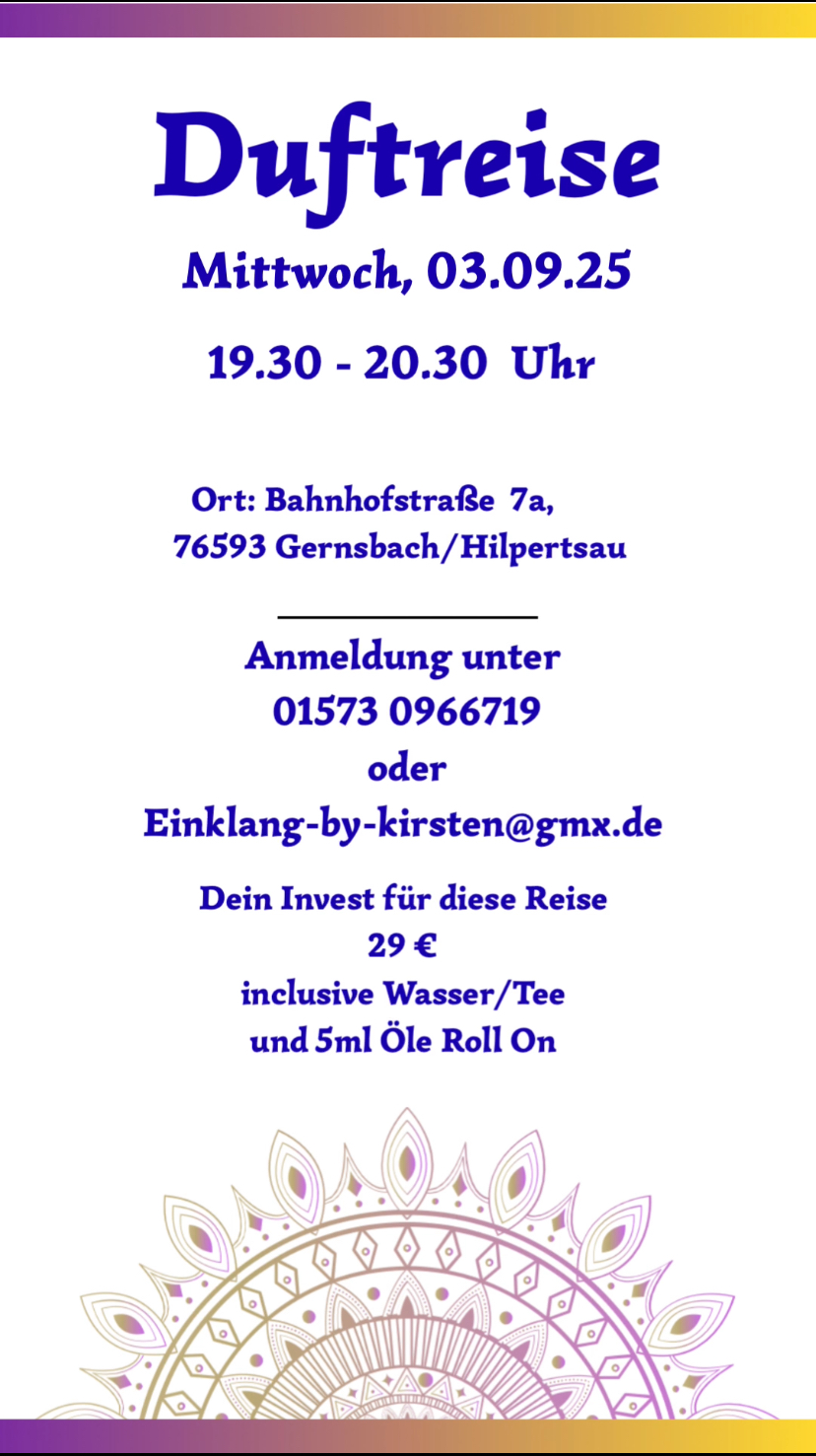Diese Duftreise/ Meditation ist eine Möglichkeit dem hektischen Alltag zu entfliehen und in eine Welt voller Harmonie einzutauchen.